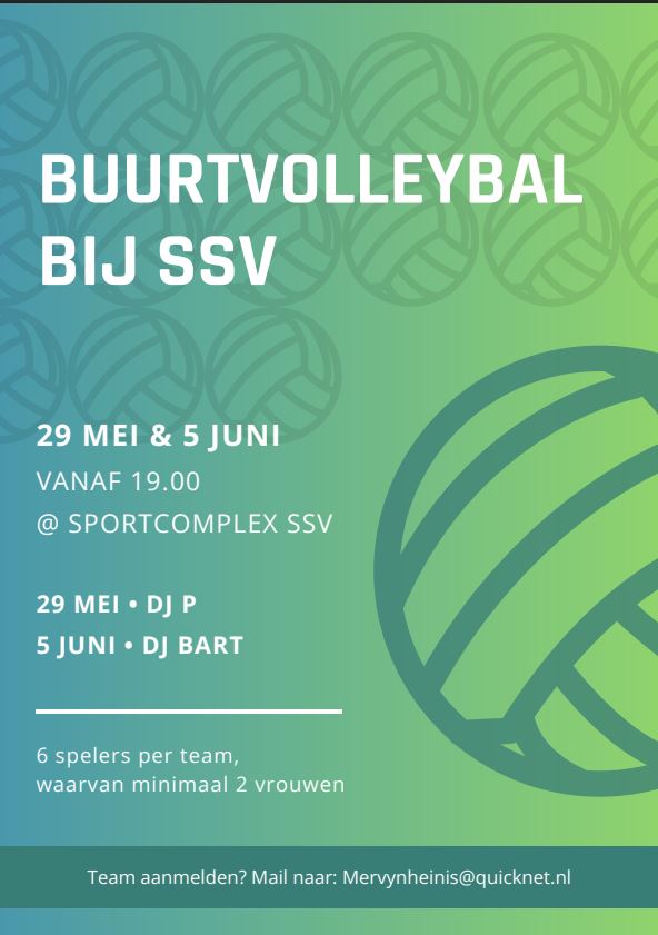 Het welbekende buurtvolleybaltoernooi bij SSV komt er weer aan. Op vrijdagavond 29 mei en 5 juni gaan gelegenheidsteams de strijd weer met elkaar aan om die felbegeerde wisseltrofee en de eer.